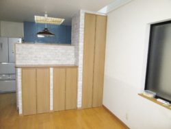 こちらのキッチン・リビングダイニングのカウンター収納棚をつくるリフォーム工事は、M様ご家族が、住まいながらリフォーム工事を行いました。