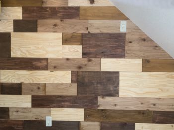 <大工さんがこだわった木材のモザイク調の壁>