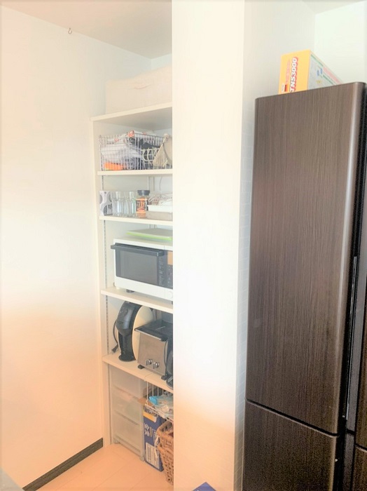 扉を付けず、オープンタイプの収納棚にしたので、トースターを8歳の子供の手の届く場所に置いたら、パンを自分で焼いたりと進んで家事に参加をしてくれるようになりました。