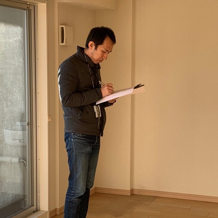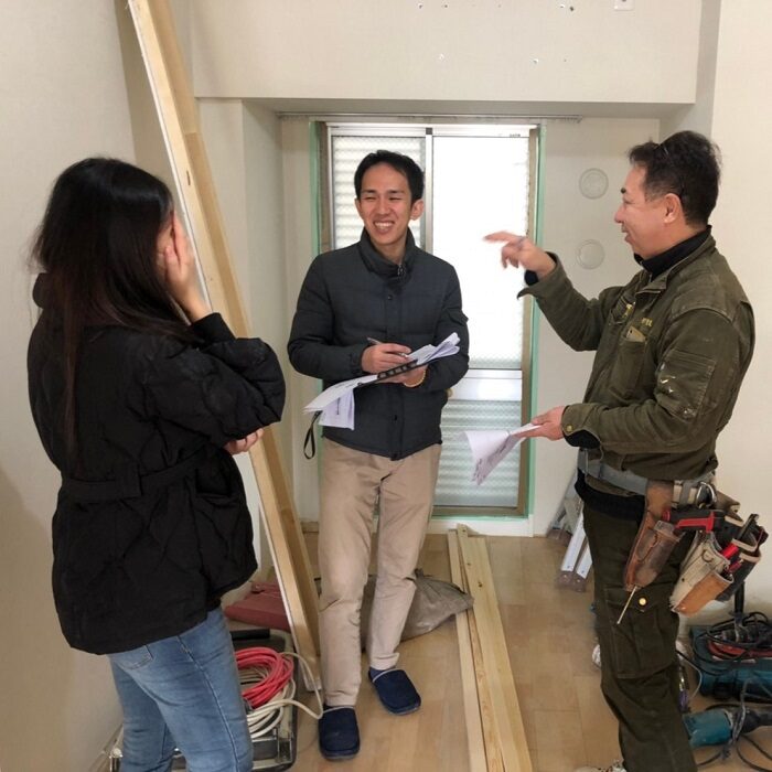 代表の菊井、設計の増田、設備工事を担当する山田、クロス・床材担当の澤田の4名で現地調査を行いました。