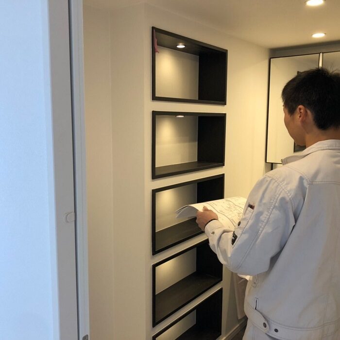 ショールームへは代表の菊井、設計の増田、コーディネーターが同行し、H様のご希望のイメージデザインにそって提案を行います。