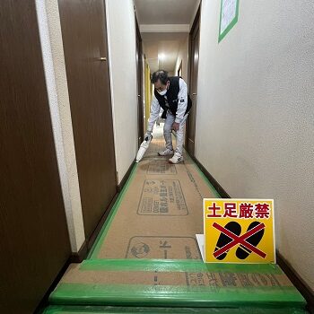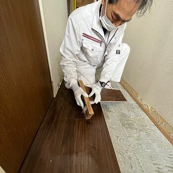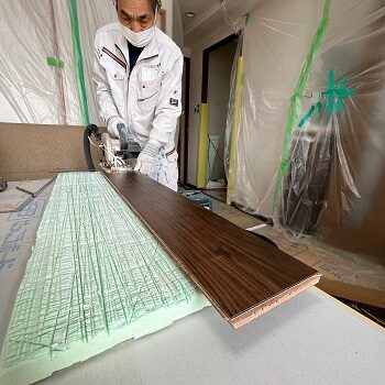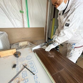 散布後1日空け、しっかりと乾燥をさせ新しい床材を貼っていきます。