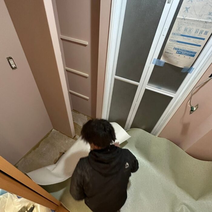サンプル帳をご覧いただき、ご希望のイメージに合わせて洗面室のクロスとクッションフロアをお選びいただきました。