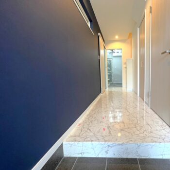 ベースには、1階の玄関ホール、エレベータ―入口、リビングに使用したネイビーのクロスを使用し、インテリアイメージに一貫性を持たせました。