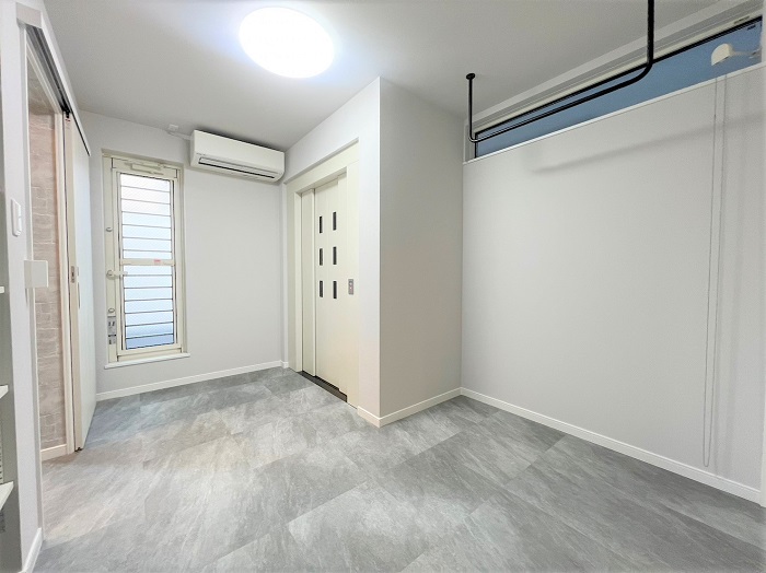 浴室・洗面脱衣室との間仕切り壁です。クロスと床のカラーを統一し、奥行きの広さを感じられるようにコーディネートをしました。