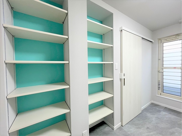 3階に新設し造作した間仕切り壁に、収納スペースを造りました。プロの職人、技術者だからこそ出来る提案とアイディアです。背面にはティファニーカラーのクロスをアクセントで使用しました。