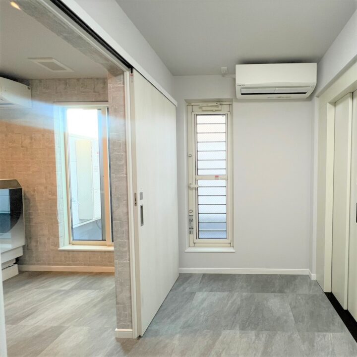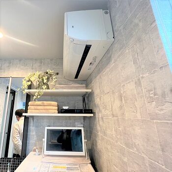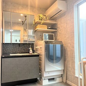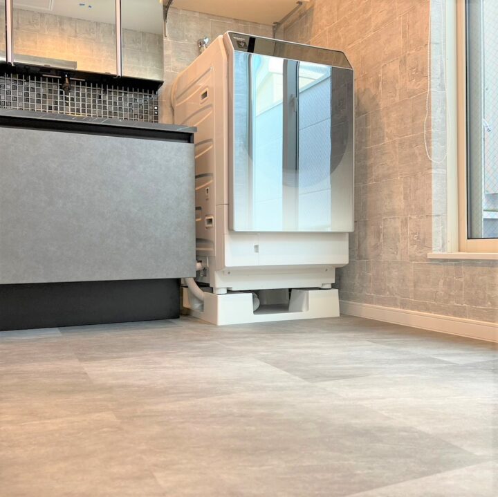 浴室・洗面脱衣室との間仕切り壁です。クロスと床のカラーを統一し、奥行きの広さを感じられるようにコーディネートをしました。