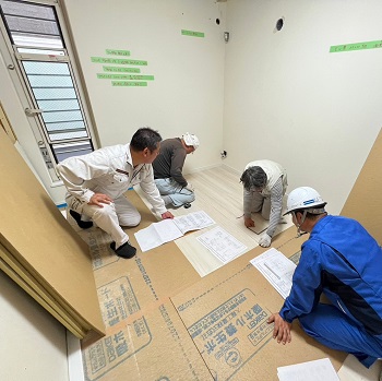 代表の菊井、設計の増田、設備工事担当の山田、クロス・床材担当の澤田の4名で現地調査を行いました。現地調査では、図面と現状の確認、採寸を行いました。所要時間は1時間ほどです。