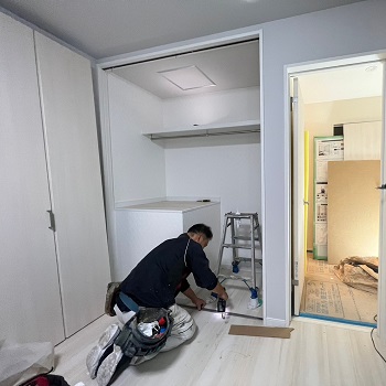 ショールームでお選び頂いた床材を貼っていきます。クローゼットの中までしっかりとこだわって頂けるのがリフォームパークスのリフォームの特徴です。