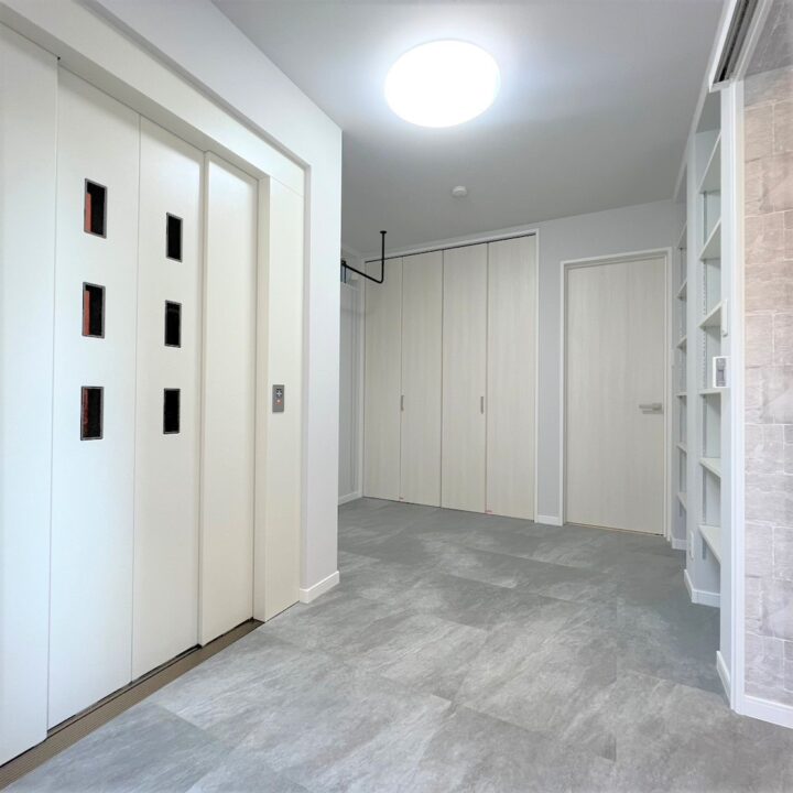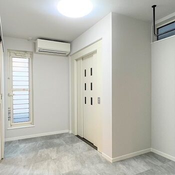 ファミリースペースの勝手口ドアとFIX窓の配置を考え、エレベータ―の新設と収納計画をたて工事を行いました。