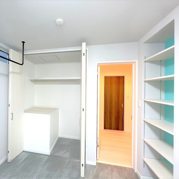 3階に新設し造作した間仕切り壁に、収納スペースを造りました。プロの職人、技術者だからこそ出来る提案とアイディアです。背面にはティファニーカラーのクロスをアクセントで使用しました。