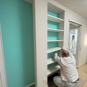 3階ホールの造作収納に棚を設置していきます。背面のティファニーカラーのアクセントがキラリと光ます。
