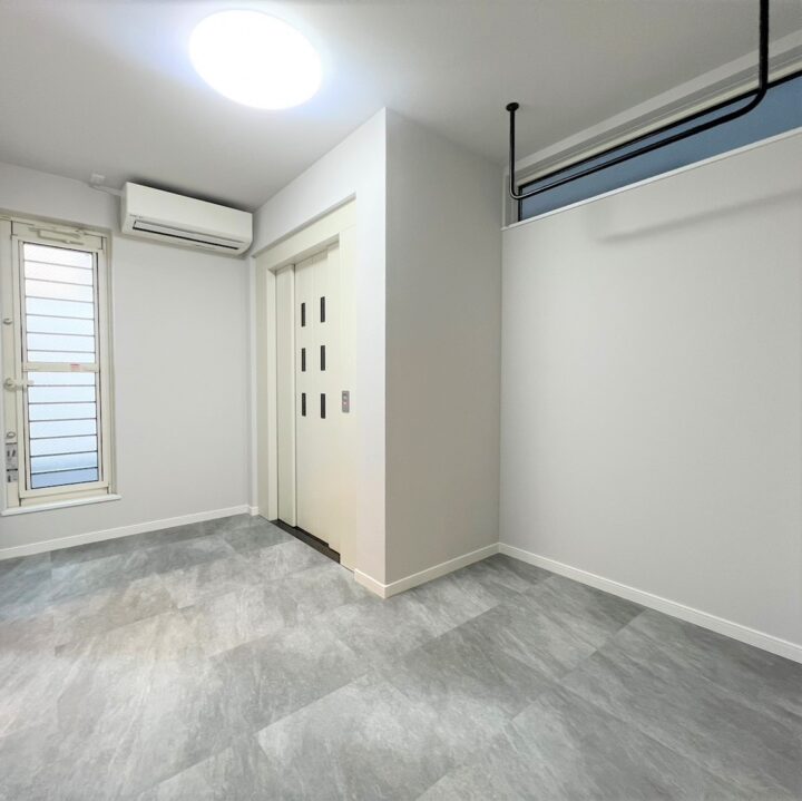 エレベータ―を設置するにあたり、壁をふかしました。ふかした壁にはクロスを貼り各フロアによって意匠性を変えました。横のスペースにはご主人様待望のアイアン製のおしゃれな《ぶら下がり健康器》を取り付けました。