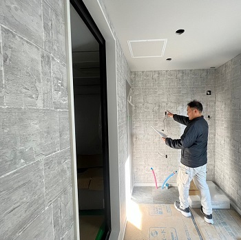浴室側の間仕切り壁を造っていきます。浴室からの音が寝室側に漏れないように工夫が施されています。