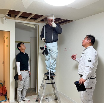 天井部分の壁紙を剝がし、解体の準備を行いました。