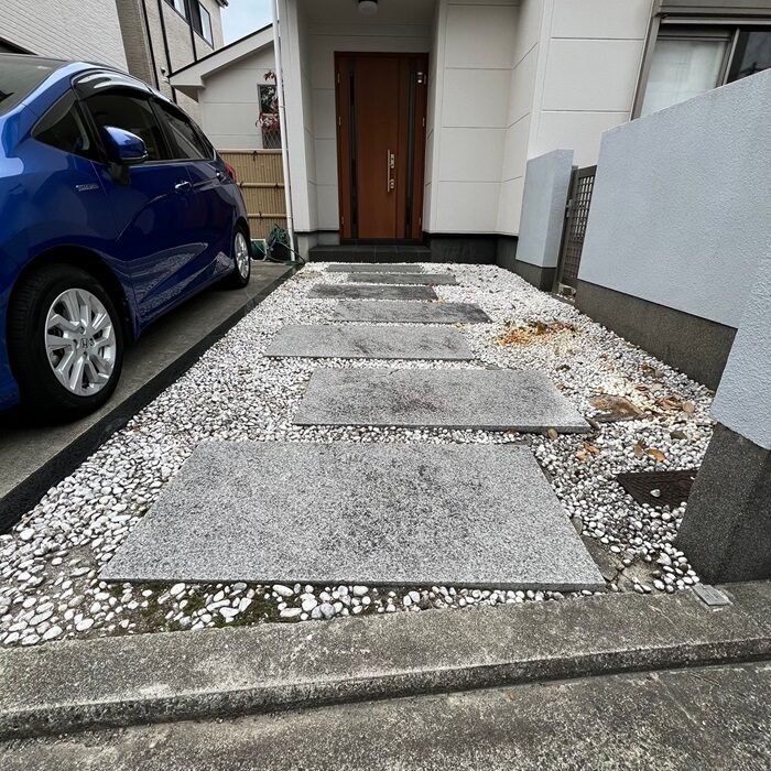玉砂利が敷かれた玄関アプローチに錆が出てしまい、雑草によるお手入れも大変というお悩みを解決するため、今までの意匠イメージを保ち、お手入れの必要がほとんどないご提案にて準備を行いました。