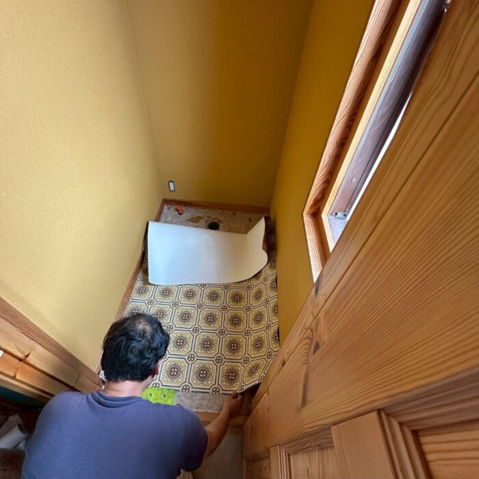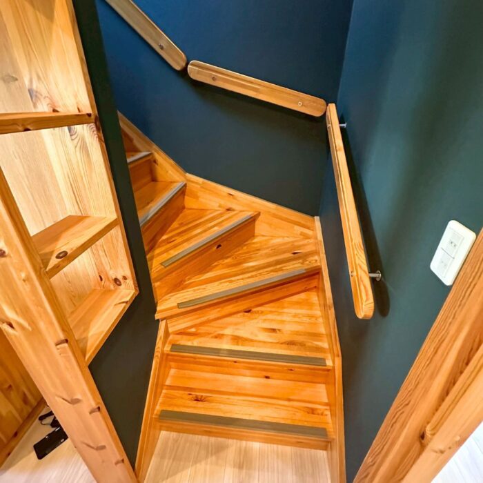 1階は他の部屋との統一感を出し、ダークグリーンと木目柄を基調に。2階は遊び心のあるクッションフロアでプライベートな空間を演出しました。