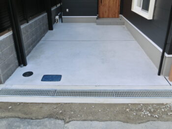 | ご提案内容 | K様、この度は、外構工事を弊社にお任せいただきありがとうございました。 お家づくりにとても真摯に取り組まれ、情熱のあるK様。お家全体にあうイメージかつ、使いやすさの動線を考えご提案をさせて頂きました。 限られたスペースだからこそ、有効に使って頂くため、ポーチの階数をさげ土間工事を行いました。 また隣家の境界には目隠しフェンスを設置させて頂きました。 |