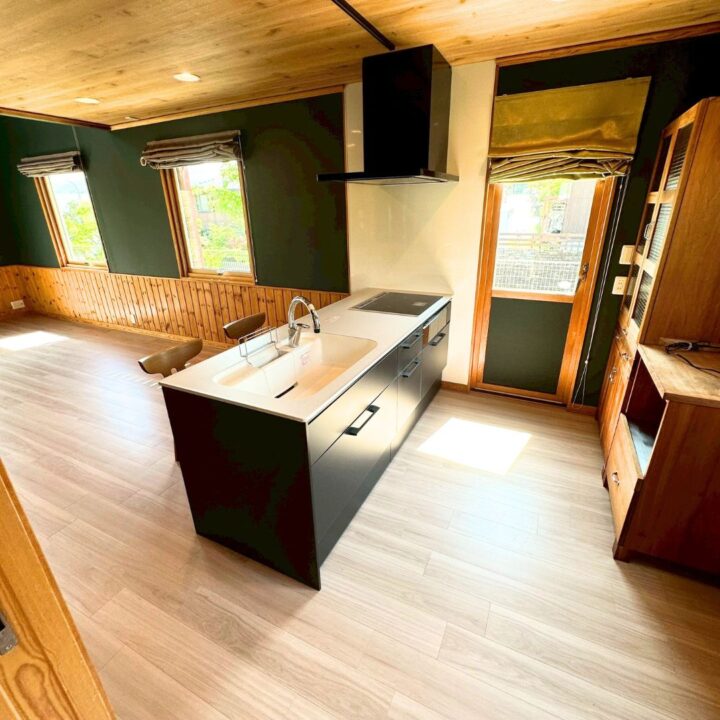 天井や腰壁にあしらわれた天然木の温もりと、都会的なブラックのコントラストが、まるで隠れ家カフェのような落ち着きと空間を創り出し、吹き抜けから差し込む、柔らかな光も、木の質感とキッチンを優しく照らし上質な仕上がりとなりました。